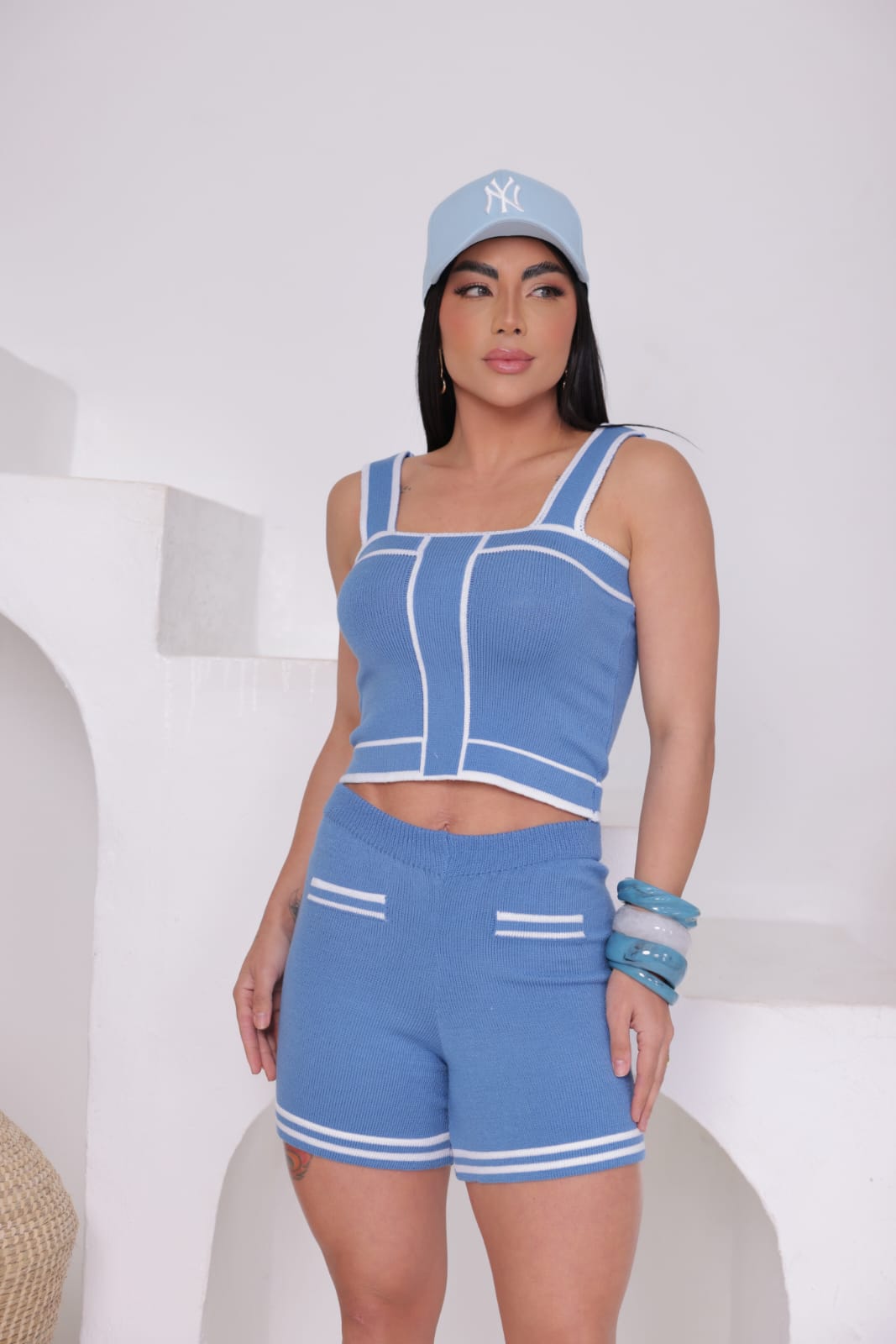 conjunto em tricot, short e crooped detalhes em vies, tamanho unico M